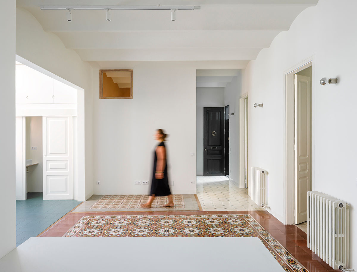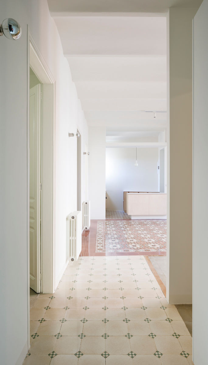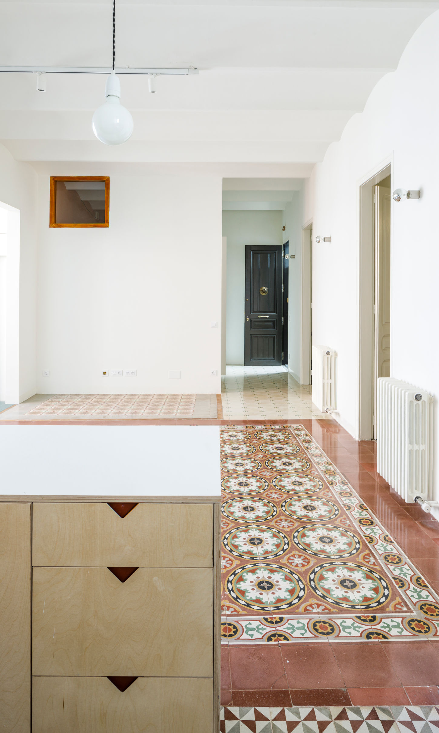 Hacia años que la propietaria de esta vivienda buscaba un hogar para ella en Barcelona. Cuando lo encontró, dos cosas la enamoraron: la luz y las vistas hacía el mar desde la cocina. Pero todavía no sabía que encima del falso techo, a 2 metros más de altura, había una cubierta de vigas y cerchas de madera, que convertirán sus 60 m2 de piso en un espacio singular y único dentro de la trama urbana de la ciudad.