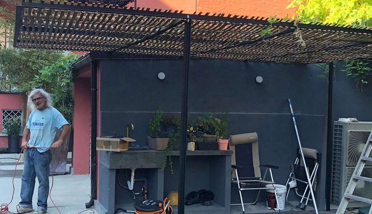 El espacio de aproximadamente 100 m2 se organiza con una piscina rectangular al fondo de la parcela y una zona de comedor debajo de una pérgola apoyada al muro del garaje.